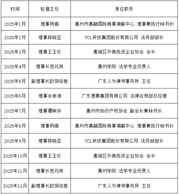 为充分调动惠州市惠融国际商事调解中心(以下简称“调解中心”)理事、监事成员共商共建,着力推动各理事与调解中心形成信息互通,资源整合运行高效的民主管理体系制度,调解中心第一届理事会第八次会议建议实行理事每月轮值主任制度(另行制订管理办法),本月轮值主任为杨璐。