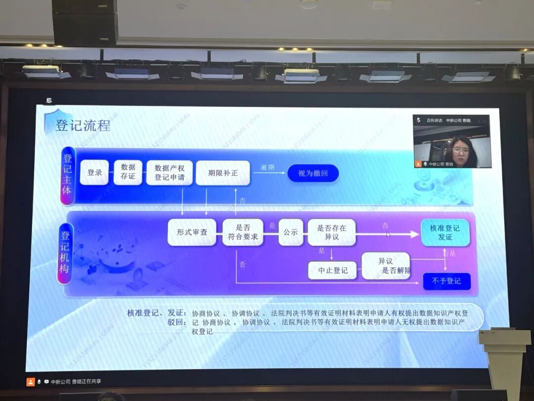 在第二讲中,广州中新知识产权项目经理曹璐围绕《数据知识产权登记实务》进行线上分享。她详细介绍了数据知识产权登记的宏观背景与重要意义,明确了可登记的数据类型与具体条件,并逐步讲解了登记流程、所需材料及实务操作中常见的疑难问题,为企业盘活数据资产、保护创新成果提供了新思路。