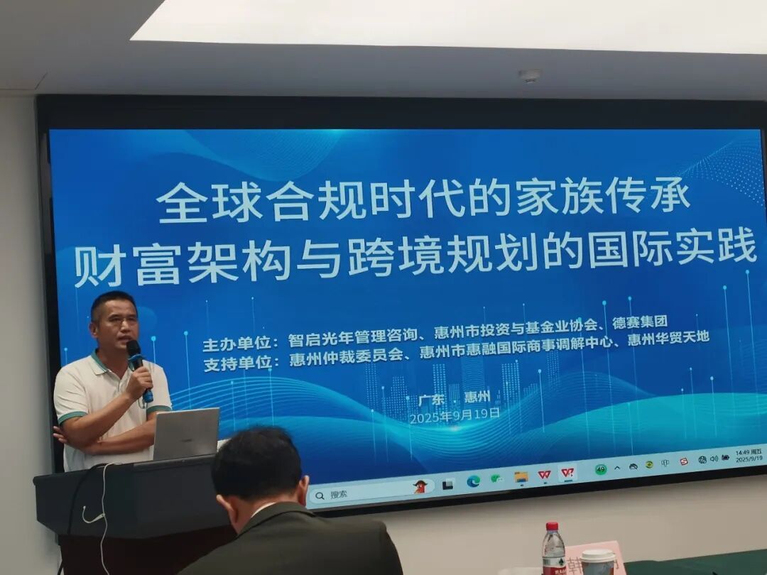 9月19日下午,一场聚焦全球合规时代家族传承重构的高端主题活动在惠州华贸大厦3号楼34层天际会客厅成功举办。本次活动由惠州市投资与基金业协会、智启光年管理咨询和德赛集团联合主办,惠州仲裁委、惠州市惠融国际商事调解中心和惠州华贸天地共同协办。