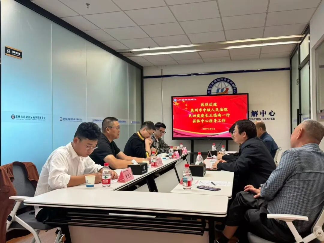 11月13日下午,惠州市中级人民法院(以下简称“市中院”)民四庭庭长王瑞南、副庭长张竹、法官助理李佳乐、书记员湛浩星到访惠州市惠融国际商事调解中心(以下简称“中心”)交流指导。中心理事长危兆宾、联合党支部书记马德斌,以及我中心粤港澳大湾区调解员代表毕文泰等共同参与座谈,双方就涉外商事争议诉调对接实务等议题进行了深入探讨。