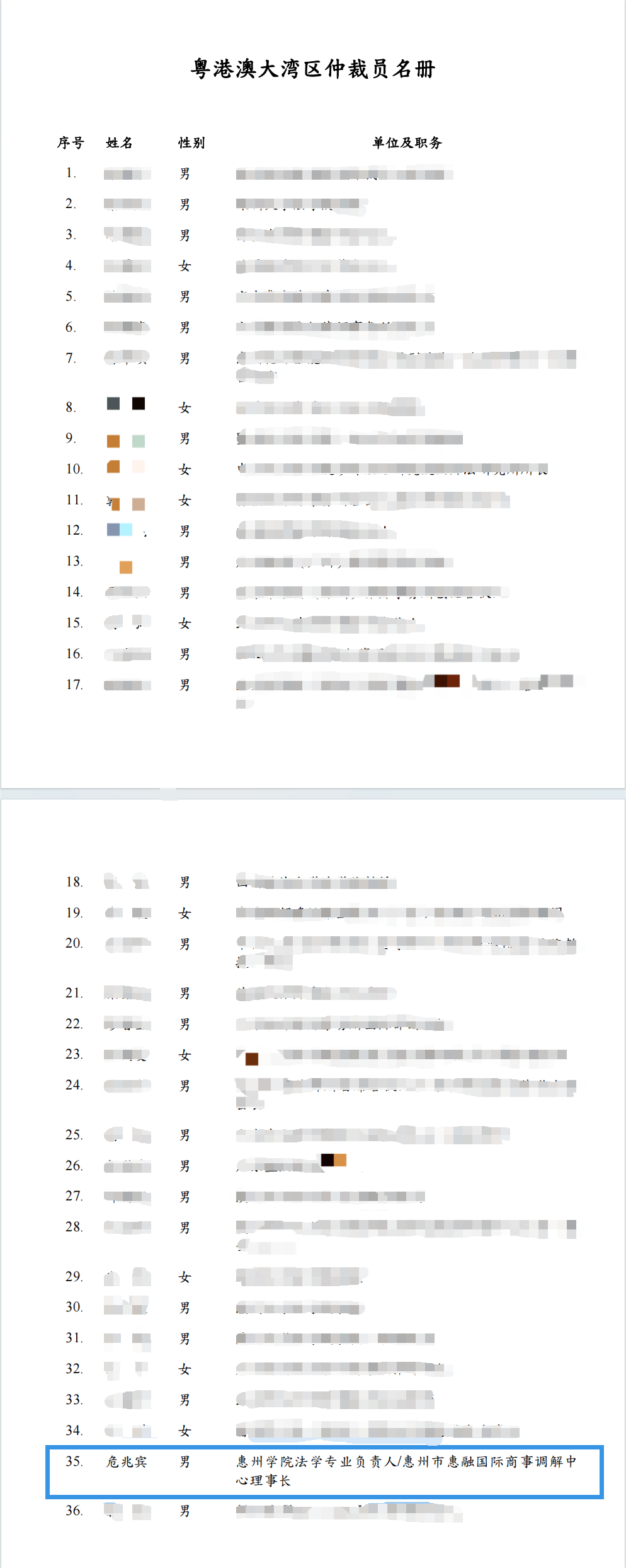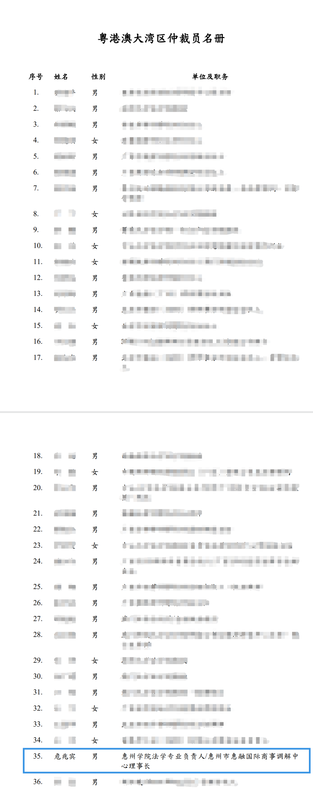2025年12月30日,广东省司法厅联合香港特区政府律政司、澳门特区政府行政法务司正式发布《粤港澳大湾区仲裁员名册》,共收录143名仲裁员。惠州市惠融国际商事调解中心理事长危兆宾成功入选,成为首批上榜的专业人士。